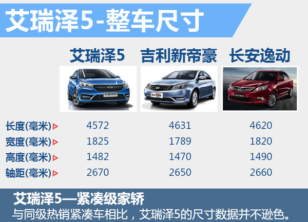 定位为紧凑级轿车的艾瑞泽5,整车尺寸数据也优于同级轿车。艾瑞泽5的长宽高分别为4572*1825*1482毫米,轴距为2670毫米。与同级紧凑轿车吉利帝豪和长安逸动相比,艾瑞泽5拥有更出众的轴距和宽度。