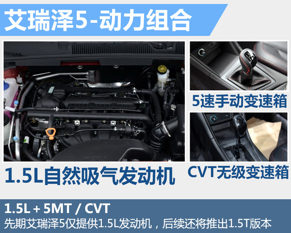 动力方面,艾瑞泽5先期将搭载一台1.5升自然吸气发动机,最大功率85kW,峰值扭矩141牛米,可分别匹配5速手动变速箱和CVT无级变速箱。新车最高车速为185公里/小时,百公里综合工况油耗为5.7升。后续还将推出搭载1.5升涡轮增压发动机的版本。