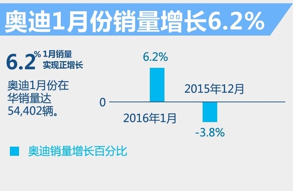一汽-大众奥迪制定的2016全年销量目标为52万辆,在去年销量基础上只要实现微弱增长,就可完成销量目标。根据奥迪官方公布的数据显示,奥迪1月份在华销量达54,402辆,与去年同期的51,248辆相比,整体增长6.2%。与去年12月出现3.8%的销量下跌相比,今年开始扭转去年微跌的状况,恢复正向增长。