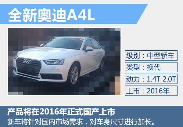 根据奥迪的规划2016年将有多达10余款新车推出,其中入门两厢车A1和中大型轿车A6L的中期改款车型分别在1月4日和22日在国内正式上市,除此之外,在今年内奥迪还将有全新一代A4L、新款A6L、A6L e-tron以及奥迪Q7 e-tron等多款新车陆续在华上市。