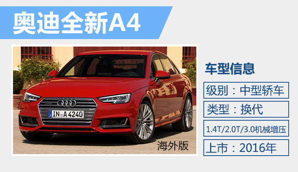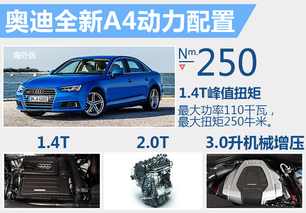 奥迪已于去年发布了全新一代A4轿车,新车基于第二代MLB平台打造,并且入门搭载了排量更小的1.4T发动机,近日,网通社从一汽-大众奥迪官方获悉:奥迪全新A4将于今年国产上市。同时,由于国家在去年10月出台1.6升及以下排量乘用车实施减半征收车辆购置税的优惠政策,所以全新A4搭载1.4T的车型将可以享受购置税减半。