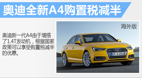 由于入门级车型搭载了1.4T发动机,在排量上符合国家出台的关于1.6升及以下排量乘用车实施减半征收车辆购置税的优惠政策,所以奥迪全新A4的1.4T车型可以享受这个政策,税率由10%下降到5%,使得消费者购车时的最终费用也得到了进一步下降。