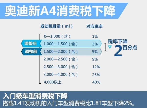现款奥迪A4搭载了1.8T发动机作为入门排量,在价格当中包括了5%的消费税以及17%的增值税,在换装了更小排量的1.4T发动机之后对应税率为3%,下调了2个百分点,以目前28万的售价计算,消费税若下降2个百分点相当于5千元左右。