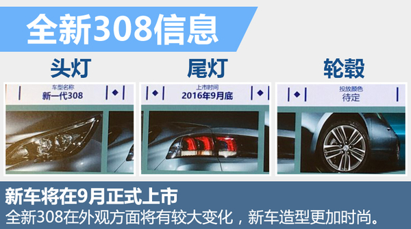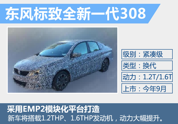 标致308在海外主打两厢车型,而东风标致308是则一款专为中国市场打造的紧凑型三厢轿车,这款问世已接近5年的车型将在今年迎来换代。近日,网通社从东风标致内部人士获悉,东风标致全新一代308将在今年9月份正式上市。新车外观方面更加动感、时尚。另外,全新308将全面搭载1.2THP、1.6THP涡轮增压发动机,动力性能将有大幅提升。