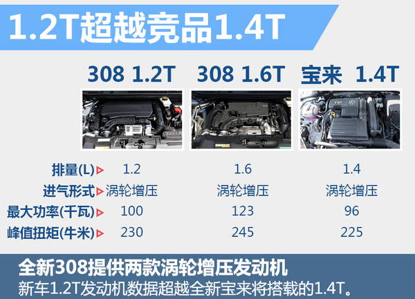 一汽-大众即将在3月底推出全新一代宝来与东风标致全新一代308同样处于紧凑型三厢轿车这一细分领域。全新宝来将采用两款EA211系列的发动机,分别是最大功率81千瓦、峰值扭矩155牛米的1.6升自然吸气发动机,以及最大功率96千瓦、峰值扭矩225牛米的1.4TSI发动机。在发动机输出数据方面,对于采用涡轮增压发动机的车型,全新一代308以排量更小的1.2THP发动机超越了全新一代宝来的1.4TSI发动机。另外,全新一代308还提供了动力更强的1.6THP车型。