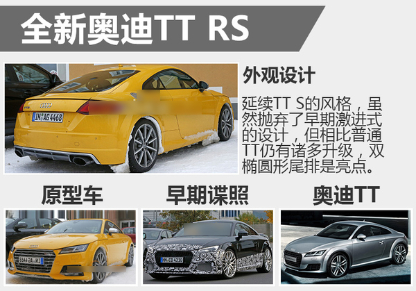 相比去年10月最早摄制的谍照,最新的TT RS原型车已脱下伪装并接近量产。在外观上抛弃了先前的蜂巢式格栅、激进的保险杠及进气设计,但采用了和奥迪TT-S相仿的外观套件。而新车最大的亮点当属尾部的双椭圆形排气口、打孔制动盘以及印有RS标识的卡钳。18英寸车轮和225/40轮胎也是原型车的标配。从内部照片来看,原型车配备了Sparco桶形座椅和6速手动变速箱。