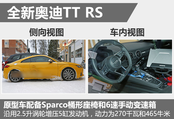 在动力上,新一代TT-RS将沿用2.5升涡轮增压5缸发动机。这部发动机已经装配在RS Q3 SUV和RS3 Sportback两款车型上,并且均具备270千瓦和465牛米的动力输出。这将至少比现款的TT-RS Plus在功率上多出5千瓦。同时,得益于全新MQB平台的先进技术,新车重量会更轻,从而比现款车型速度更快。
