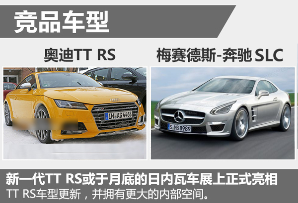 奥迪全新一代TT-RS或于今年三月举办的日内瓦车展上正式亮相,新车在上市后将与梅赛德斯-奔驰SLC展开竞争。奥迪TT-RS车型在经历换代后,有望具备更大的内部空间,并且依靠四驱系统的搭载,从而在实用性与操控表现方面占据一定的优势地位。