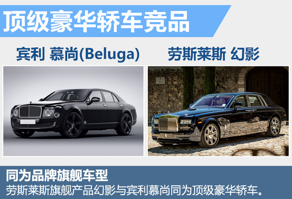 一直以来,宾利与同为英国顶级豪华汽车品牌劳斯莱斯不断相互竞争和促进,而宾利慕尚和劳斯莱斯幻影作为两大品牌的旗舰车型,更是成为相互体现宾利和劳斯莱斯造车理念的缩影。慕尚和幻影同样采用非常丰富的奢华内饰设计,外观虽然不同但都独具特色。动力方面,幻影搭载一台6.7升V12自然吸气发动机,最大功率338千瓦,峰值扭矩720牛米,相比宾利Beluga特别版动力不占优势。