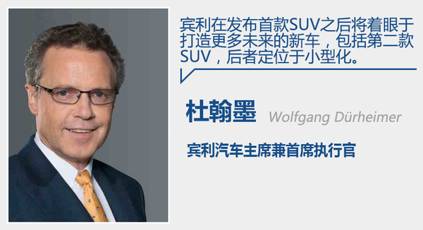 宾利2015年全球销量为10,100辆,同比下滑5.6%。但首款SUV添越推出后,其订单已超过2020年全球目标销量预期,SUV车型的推出是宾利销量增长重要支撑点。此前,宾利汽车主席兼首席执行官沃尔夫冈•杜翰墨(Wolfgang Dürheimer)曾表示,宾利发布首款SUV之后将着眼于打造更多未来的新车,包括第二款SUV,后者定位于小型化。为了与大型SUV添越形成差异化,第二款SUV定位较其低一级别,但杜瀚墨所谓的小型化则是中型SUV产品。宾利的这款全新SUV车型将在2017年推出,上市后将开辟超豪华品牌中型SUV细分市场,提升宾利的市场竞争力。