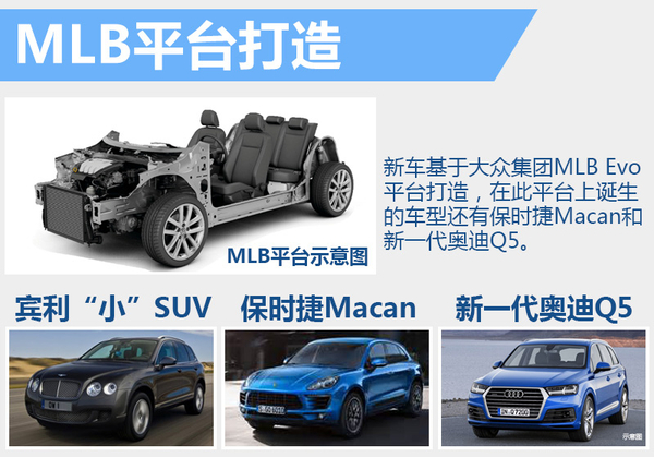 全新“小”SUV将在宾利位于英格兰克鲁总部一个新的制造厂投产,并基于大众集团MLB Evo平台打造。在此平台上诞生的车型还有保时捷Macan和新一代奥迪Q5。大众集团的模块化平台共享战略将为新车节省大量的研发成本,同时缩短了研发时间。MLB Evo平台采用纵置发动机结构布局,这种设计可以使车身长度不变的条件下充分提升前排乘客的腿部空间,将整车重心向后平移,达到最理想的平衡性。宾利全新SUV有望使用铝合金、碳纤维复合材料等轻量化材料打造,在保证车辆刚性同时还可降低车身重量从而减少油耗。
