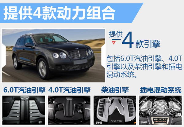 在动力方面,宾利将为这款“小”SUV提供4款动力总成,包括6.0升12缸汽油增压引擎、4.0升8缸汽油增压引擎以及柴油引擎和混动系统。其中6.0升W12双涡轮增压引擎最大功率可达447千瓦,峰值扭矩为900牛米;而4.0升V8双涡轮增压引擎目前也应用在飞驰车型上,最大功率为373千瓦,峰值扭矩可达660牛米。此外,插电式混动版车型将在新车上市后推出。