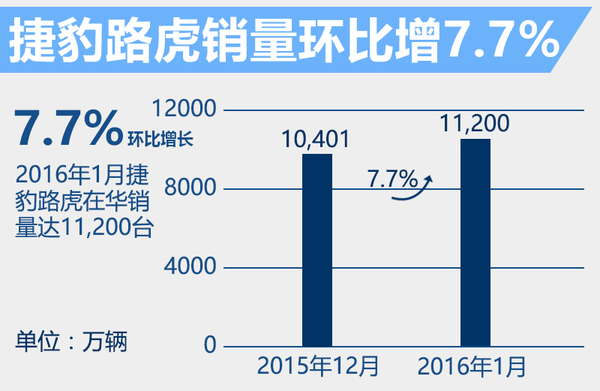 在中国市场,捷豹路虎2015年全年销量为92,474台,尽管与2014年全年销量同比下降,但是在2015年下半年销量逐渐回暖,12月当月销量达10,401辆,实现年度第五次连续增长,在今年一月捷豹路虎环比增长7.7%,使得过去6个月实现持续环比增长。