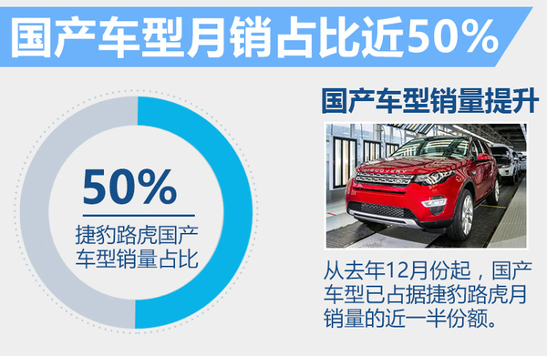 根据捷豹路虎公布的信息,从去年12月份起,国产车型已占据捷豹路虎月销量的近一半份额。在今年,捷豹路虎将向中国市场推出首款捷豹国产车型,此前网通社从捷豹路虎内部人士获悉,新车有望在四月开幕的北京车展上亮相。