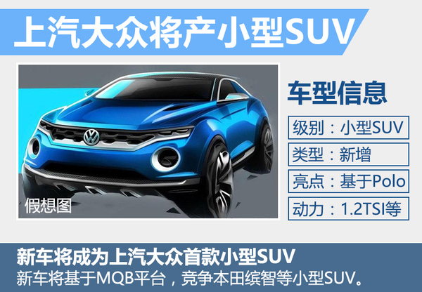 在即将于今年三月开幕的日内瓦车展上,大众将展出一款全新概念车T-Cross,新车将是未来大众小型SUV的雏形。未来量产车型将基于polo打造,之后有望在上汽大众生产,新车将进入本田缤致等车型所在的小型SUV细分领域。据了解,这款SUV的定位将低于大众途观,并基于MQB平台打造,动力方面有望搭载1.0L三缸、1.2TSI三缸以及1.4TSI多款增压发动机。