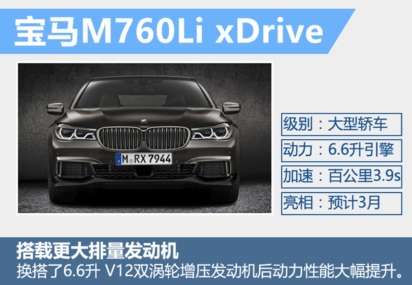 全新一代7系于2015年10月份正式上市,新车推出了740Li和750Li(分别搭载3.0T、4.4T发动机)两种动力车型。今年全新一代7系将推出更多版本,搭载更多排量的发动机以满足消费者的需求。近日,网通社从宝马汽车官方获悉,在今年3月开幕的日内瓦车展期间,宝马将推出M760Li xDrive,新车在外观细节有所改动。同时在动力方面,车辆将搭载6.6升V12双涡轮增压发动机,百公里加速仅需3.9秒。