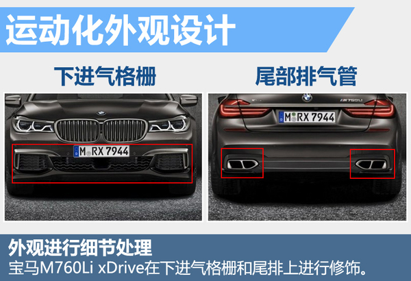 宝马M760Li xDrive配备了一系列空气动力学套件,整体轮廓变化并不是很大,线条设计采用家族式的设计语言。新车仍然配备标志性的双肾进气格栅,而前大灯采用开眼角设计并标配LED光源。下进气格栅变化为采用横贯式的设计并配有波浪状饰条,两侧的雾灯也采用LED光源。此外,车尾排气管设计也有所改变同时配备一款全新样式轮毂,轮胎规格分别为分别为245/40 R20与275/35 R20。