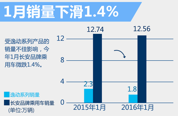 在2015年中国汽车市场增速放缓的大背景下,长安品牌乘用车累计销售100.7万辆,同比增长30.9%,高于行业15.3%的增速,完成逆势增长。进入2016年,长安汽车坚持发展方向,将推多款新车。长安汽车股份有限公司总裁朱华荣表示:“我们将坚持技术创新,今年将推出CS15等15款产品。”其中乘用车10款。网通社从长安汽车官方获悉:2016年1月,长安品牌乘用车累计销量125,594辆。受长安轿车产品逸动系列的销量不佳影响,今年1月乘用车的总体销量同比微跌1.4%。