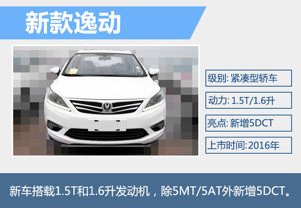 作为长安品牌轿车阵容中的重要产品,逸动系列将在今年推出改款车型。新车外观和内饰均有变化,包括新增LED日行灯、一键启动等配置。动力方面将延续现款搭载的1.5T涡轮增压发动机和1.6升自然吸气发动机,最大功率分别为125/92千瓦,峰值扭矩为230/160牛米。传动方面,新车除了延续现款匹配的5速手动、5速手自一体变速箱以外,还将匹配长安自主研发的5速双离合变速箱。