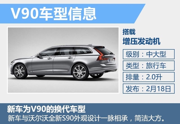 沃尔沃在去年发布了全新SUV车型XC90,年底前又发布了旗舰车型S90,二者均来自沃尔沃全新SPA模块化平台打造。作为“90”系列的重要成员之一,V90也将通过此架构进行打造,新车将于2月18日发布,之后在日内瓦车展上完成首秀。外观上,新车与“90”系列车型设计一脉相承。“雷神之锤”的前LED日间行车灯与宽大的进气格栅显出咄咄逼人的气势。V90的尾部线条设计灵感源自Estate概念车,使得尾部线条十分流畅。