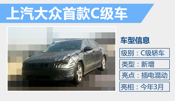 此前大众汽车已经推出了概念车C Coupe GTE Concept,上汽大众将要推出的C级车就是根据这款概念车设计而来。新车将于日内瓦车展前夜的“大众之夜”上亮相。外观方面,新车将沿用大众全新的家族风格,与全新一代帕萨特有几分相似。大灯和进气格栅融为一体,并有望采用LED光源。动力方面,新车除了传统动力版本外,还将推出插电混动版本。