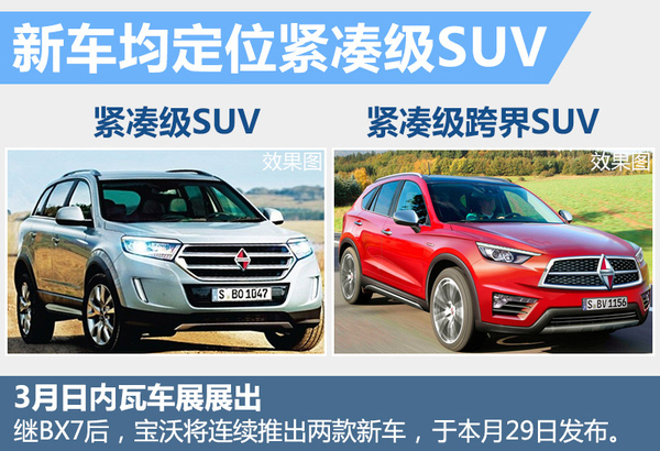 在宝沃的产品规划中,SUV是现阶段发展中的重中之重,全新车型BX5、BX6将于2016年2月29日在瑞士日内瓦全球首发。两款新车均定位于紧凑级SUV,与奥迪Q3与宝马X1属于同一级别,其中BX6将是BX5的跨界车型。在两款新车亮相后,宝沃SUV产品线将增至3款车型。