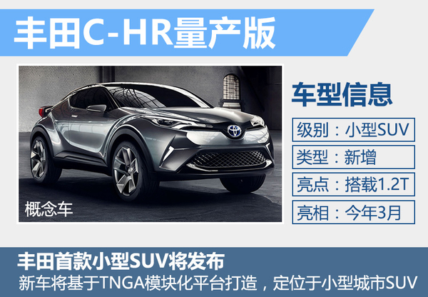 丰田C-HR量产版车型将作为丰田首款小型SUV,在今年的日内瓦车展亮相。新车在外观设计方面将运用C-HR概念车的设计语言,量产版车型与概念车的最大区别在于采用了5门版的设计,相比3门版的概念车而言,量产版C-HR将具有更强的使用性。此款新车也将成为丰田全新入门级SUV产品,将进入本田缤智等车型所在的小型SUV细分领域。