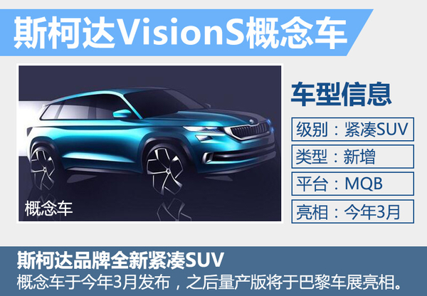 斯柯达将推出全新SUV概念车—Vision S,新车将基于MQB平台打造,不仅与大众全新一代途观采用相同的生产平台,还有望配备三排座椅,以便容纳包括驾驶者在内的6名驾乘人员。与此同时,虽然新车的轴距尚未公布,但4.7米的车身长度、1.91米的宽度、以及1.68米的车身高度则在一定程度上为车内空间提供了充足保障。