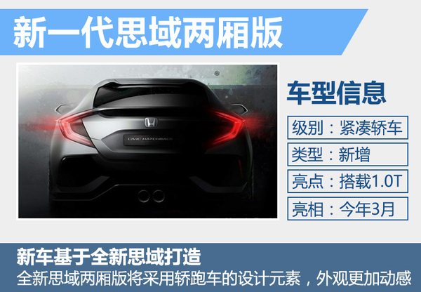本田在此前推出了全新一代思域,在今年日内瓦车展期间全新思域两厢版也将正式亮相,新车将搭载排量更低的1.0升涡轮增压引擎。在外观设计方面,本田全新一代两厢版将采用轿跑车的设计元素。新车不仅会推出五门掀背版本,还有望在车尾部分采用中置双出式排气尾管,并且配备有车尾扰流翼与LED光源的尾灯组。