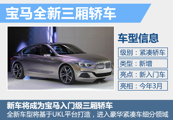 1系是宝马旗下一款入门级紧凑型两厢车,目前以进口形式在国内销售。在去年的广州车展期间,宝马曾发布了一款名为Compact Sedan的概念车,其有望成为宝马全新入门级轿车的雏形,在今年的日内瓦车展上,宝马这款全新车型有望正式亮相,之后有望在今年四月的北京车展上实现国内首发。