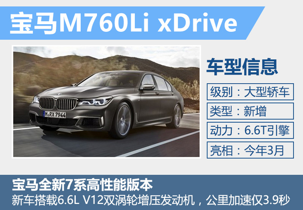 宝马不久前正式发布了M760Li xDrive的官图,新车配备了一系列空气动力学套件,包括全新样式的前保险杠和后行李箱盖的扰流板。此外,车辆还配备了一款全新样式的轮圈,前后轮胎规格分别为245/40 R20与275/35 R20。动力部分,新车搭载6.6L V12双涡轮增压发动机,最大功率为441千瓦,峰值扭矩达到800牛米,传动部分匹配8速自动变速箱,百公里加速仅需3.9秒,新车有望在年内引入中国市场。