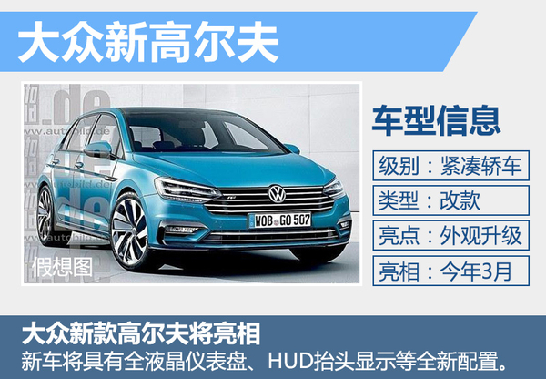 大众第七代高尔夫距离上市已有超过3年的时间,按照产品更换周期,高尔夫在今年将迎来中期改款车型,新车在今年的日内瓦车展上有望发布。新款高尔夫前大灯将配备LED前大灯。另外,高配车型还将具有全液晶仪表盘、HUD抬头显示等配置,并装配了包括带有9.2英寸显示屏的MIB信息娱乐系统以及高尔夫R Touch上配备的触控功能。
