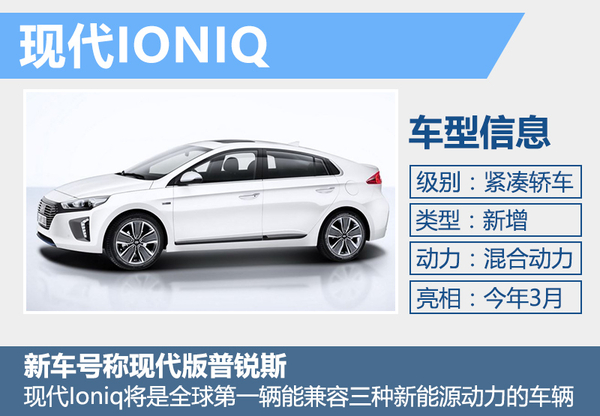 现代IONIQ是现代汽车的一款混动产品,不久前刚刚在韩国本土完成了发布,新车在日内瓦车展上将正式亮相。现代Ioniq将是全球第一辆能同时兼容三种新能源动力的节能车款。其中,EV纯电动版本会由锂电池提供电力来驱动电动马达;插电式油电车款(PHEV)能通过外来电源替电池充电,增加纯电动行驶里程;油电版本(HEV)则能通过发动机发电及从车辆动能回收电力,供应给电动马达使用作为辅助发动机的动力。