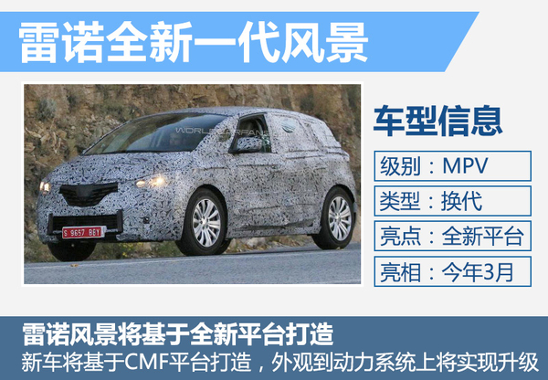 在此次的日内瓦车展期间,雷诺也将公布全新风景,这款MPV迎来了自己的换代产品。据了解,车辆将采用雷诺日产联盟最新的CMF模块化平台进行开发,相比现款车型,全新风景从外观到动力系统上将实现全面的升级。在日内瓦车展亮相后,新车有望于北京车展实现国内首秀,之后在年内引入国内市场。