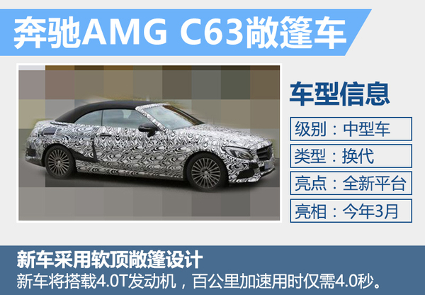 奔驰将推出新AMG C63敞篷车,新车将搭载4.0T发动机,动力大幅提升,百公里加速用时仅需4.0秒。奔驰新AMG C63敞篷车使用了与标准版C级敞篷车相同材料的软顶敞篷,同时采用了全新造型前保险杠并加宽车轮,有助于提高抓地力,从而提升车辆的整体性能表现。新车内部将使用多功能赛车式方向盘和运动座椅,同时配有AMG专属内饰和排挡把。