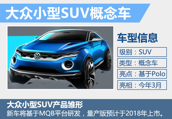 大众将推出一款全新入门级SUV概念车T-Cross,新车基于MQB平台研发,量产版预计于2018年上市,新车将进入小型SUV细分领域。在外观设计上,概念车采用Polo两厢车型的设计理念,T-Cross的定位略低于大众于2014年推出的基于高尔夫车型研发的T-Roc概念车,概念车的推出预示着大众汽车将在小型SUV将更加细分化。