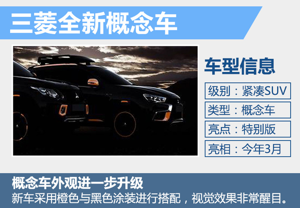 在即将开幕的2016日内瓦车展上,三菱将发布基于2016款ASX和L200打造的全新概念车型。从此前发布的预告图可以看出,新车相比ASX在外观上将采用橙色与黑色的搭配,整体将更加动感。同时,三菱还有望在2016日内瓦车展展出eX概念车,这款概念车定位于紧凑级电动SUV,其续航里程能达到400km以上。