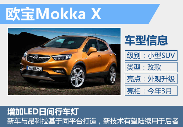 在此次的日内瓦车展上,欧宝将推出Mokka X车型,新车将是新昂科拉的姊妹车型。在外观设计上,欧宝为Mokka车主提供多种选择,车主可以选购配置自适应LED大灯和LED尾灯。此外,新款车型还配备双翼形LED日间行车灯。随着新车的推出,Mokka X上锁使用的设计语言以及配置均有望在昂科拉车型上配备。
