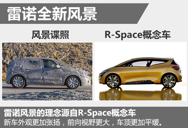 雷诺风景的设计理念源自R-Space概念车,并且会沿用最新车型梅甘娜、科雷嘉和塔利斯曼的设计思路。尽管谍照中并未曝光详尽细节设计,但新车的进气格栅将会更加夸张,配有细长的前大灯和更低、更阔的进气口。同时,全新风景的发动机舱也有望进一步缩短,从而提供面积更大的前挡风玻璃以及更平缓的车顶线条。