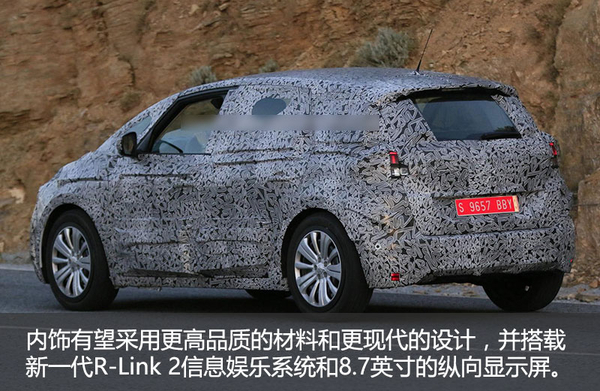 在内饰设计中,雷诺全新风景有望采用更高品质的材料和更为现代化的设计理念,这将是在现款车型的基础上所进行的一次重大升级。虽然谍照中没有内部细节的展示,但新车依旧会搭载全新一代R-Link 2信息娱乐系统和8.7英寸的纵向显示屏。