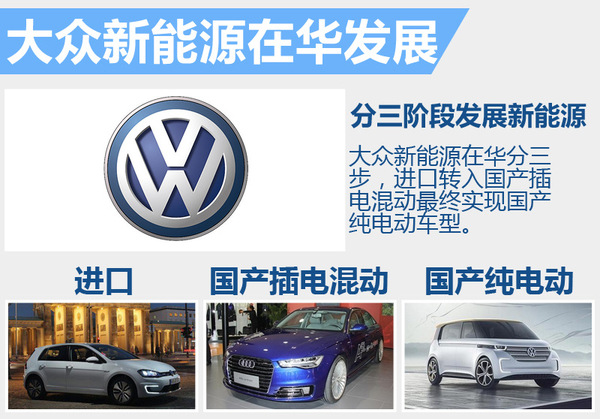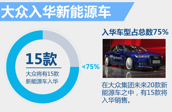 在新能源领域,大众集团已经先后已经有多款车型问世如electric up!、高尔夫GTE、奥迪A3 e-tron等。穆伦表示:“现在我们已拥有纯电动汽车和插电式混合动力汽车,到2020年,我们还将陆续推出20款新能源汽车。”同时作为大众集团最为重要的市场,大众将在华投放15款新能源车。占车型总数的百分之75%,在这其中,一汽-大众奥迪A6L e-tron率先进行国产化工作。