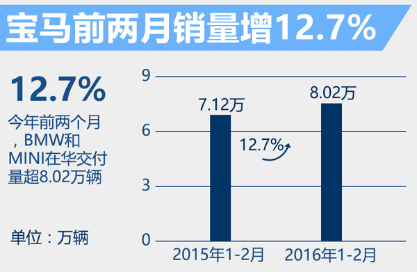 根据宝马集团公布的数字显示,2016年前两个月,BMW和MINI汽车在中国的交付量增长12.7%,达到80,215辆。在车型方面,BMW 2系同比增长184.3%,共交付1,754辆。同时,宝马X1增长达到27.2%,达8,927辆;BMW X3增长82%,达6,613辆。此外,全新一代BMW 7系的730Li也在3月初正式上市,接下来将进一步带动销量增势。在轿车方面。前两个月BMW 5系和3系表现继续突出,成为宝马在中国的销量冠亚军。