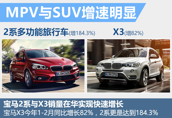 宝马2015年在华销量为464,086辆,同比2014年小幅增长1.7%,在今年宝马还将通过新车的投放,以希望取得更快速的增长。网通社从宝马官方获悉:在2016年1-2月,宝马旗下BMW和MINI品牌在中国的交付量增长12.7%,达80,215辆。这其中MPV与SUV细分领域增速最为明显,在去年以进口引入中国的2系同比增长184.3%,此外宝马X3增长幅度达到82%,两个领域的销量增长,进一步拉升宝马在华的整体表现。