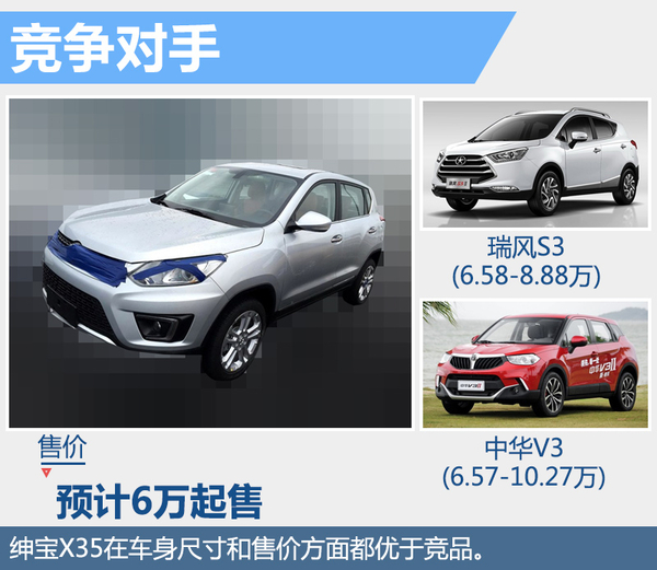 绅宝X35所处细分市场中,江淮瑞风S3与中华V3所属同一细分市场,未来绅宝X35将与二者展开市场竞争。数据显示,瑞风S3车身长宽高分别为4325*1765*1625毫米,轴距为2560毫米;中华V3车身长宽高分别为4200*1790*1600毫米,轴距为2570毫米,相比之下绅宝X35尺寸占优。售价方面,瑞风S3售价区间为6.58-8.88万,中华V3售价区间为6.57-10.27万,而绅宝X35预计6万起售也占有一定优势。