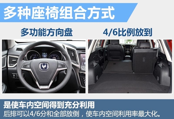 内饰上新车延用了老款车型飞翼式的设计,配置方面两车基本相同,使用织物面料座椅替代皮质座椅,配备多功能方向盘。CS75的后备厢容积为590升,后排座椅支持4/6比例折叠,折叠后最大装载空间可达1560升,且折叠后与后备厢地板齐平,在日常的使用中提供了便利。