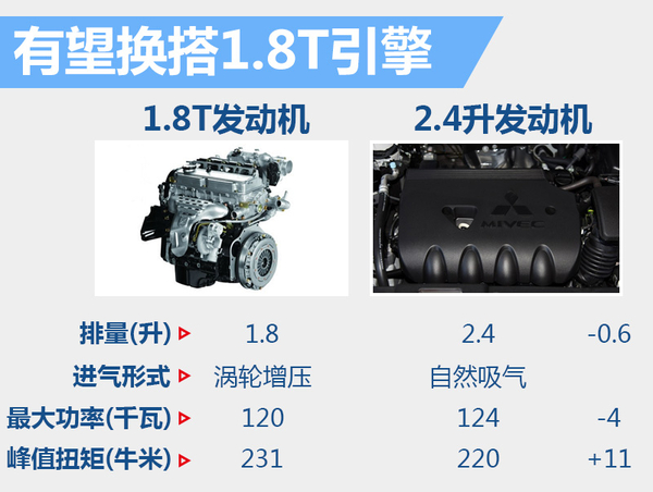 动力方面,现款欧蓝德搭载2.0升和2.4升两款自然吸气发动机,其中2.4升发动机最大功率为124千瓦,峰值扭矩220牛米。广汽三菱欧蓝德上市后,有望搭载由沈阳航天三菱提供的1.8T涡轮增压发动机。这款发动机拥有水冷废气涡轮增压、双平衡轴机构、整体型主轴承盖等多项特有技术,最大功率为120千瓦,峰值扭矩为231牛米。通过对比可知,1.8T增压发动机在扭矩输出方面优于现款2.4升自然吸气发动机。