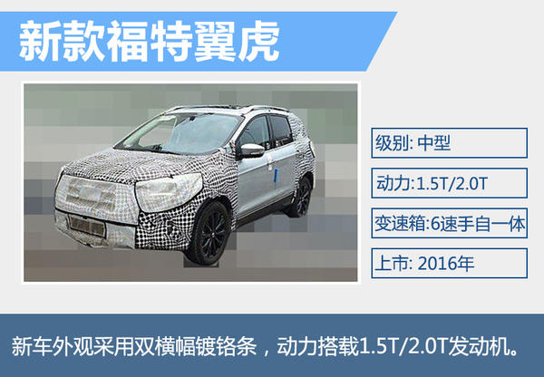 福特去年公布了“创新2020战略”,未来五年将在华陆续引入20款新车型,包括对现有车型进行改款、换代以及推出全新产品。根据福特产品规划,旗下中型SUV翼虎将迎来改款,新车有望年内上市。在外观方面,新车与海外版保持一致,中网采用更为硬朗的双横幅镀铬装饰。动力方面,新款翼虎将延续现款车型动力系统,包括一台EcoBoost 1.5升GTDI涡轮增压发动机,最大功率133千瓦,最大扭矩240牛米;此外还有一台动力更强的2.0T发动机。传动部分匹配一台6速手自一体变速箱。