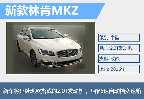 定位中型豪华轿车的MKZ,是林肯重返中国市场后推出的首款轿车产品。在今年初的北美车展中,新款MKZ正式亮相。外观方面,新款MKZ最大变化在于全新的前脸造型设计,一改此前的飞翼式进气格栅设计,而是采用与Continental相似的银色网状格栅设计。此外,头灯也采用较为方正的造型设计,内部配有LED日行灯。新车尾部变化不大,延续现款车型设计。动力方面,新款MKZ将延续现款车型搭载的2.0升EcoBoost涡轮增压发动机。