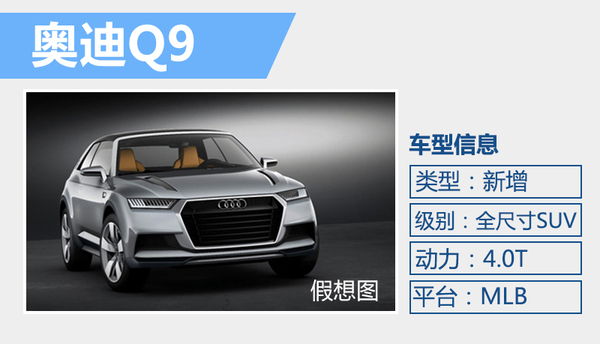奥迪旗下的SUV产品阵容中,目前拥有Q2、Q3、Q5、Q7四款产品,上述SUV车型实现从紧凑型到中大型细分领域的覆盖。在现有产品的基础上,奥迪还将进一步扩大SUV产品阵容,并进入到更多全新领域之中。网通社整理了奥迪新车规划后发现,未来奥迪还将推出全尺寸SUV。根据奥迪的产品命名体系,预计奥迪全尺寸SUV将命名为Q9,上市后将进入奔驰GLS所在的细分市场。