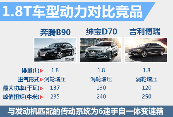 目前国内自主品牌中,北汽集团旗下的中型轿车绅宝D70推出市场已有3年时间。就现款车型的动力而言,奔腾B90搭载1.8T发动机的车型,可实现最大功率137千瓦、峰值扭矩235牛米的动力输出。北汽绅宝D70 1.8T车型最大功率为130千瓦、峰值扭矩达到240牛米。处于同一细分领域的吉利汽车旗下中型轿车博瑞,唯一的涡轮增压车型同样是1.8T,最大功率为120千瓦,峰值扭矩达250牛米。通过对比两项动力参数,可以看出三者处于同一水平。